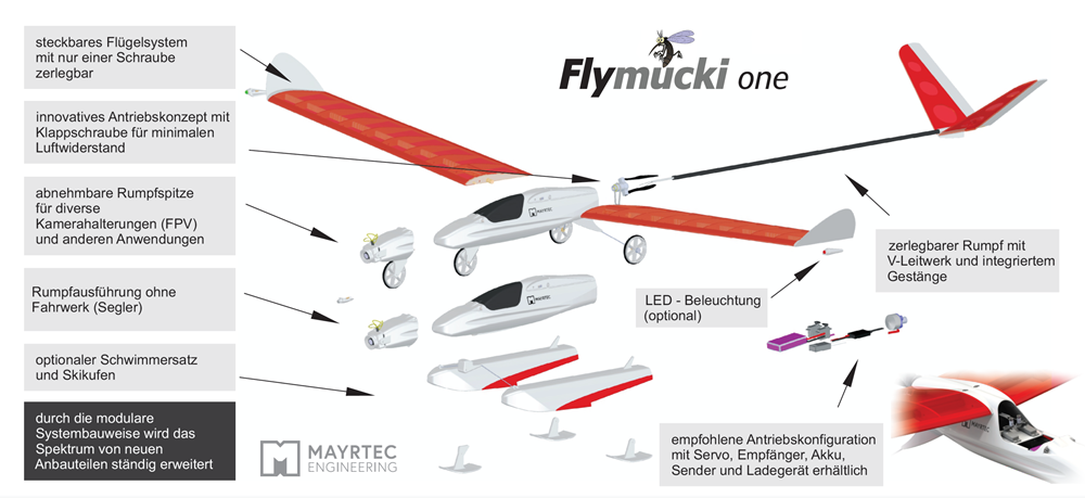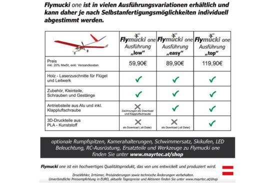 Falls Sie Interesse an unserem Modell haben, finden Sie alle verfügbaren Modellvarianten in unserem Onlineshop: https://www.mayrtec.at/shop/flymucki/fmone-modell/