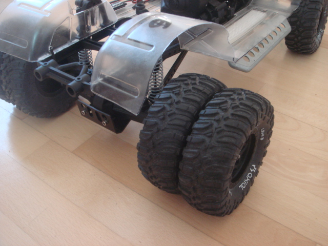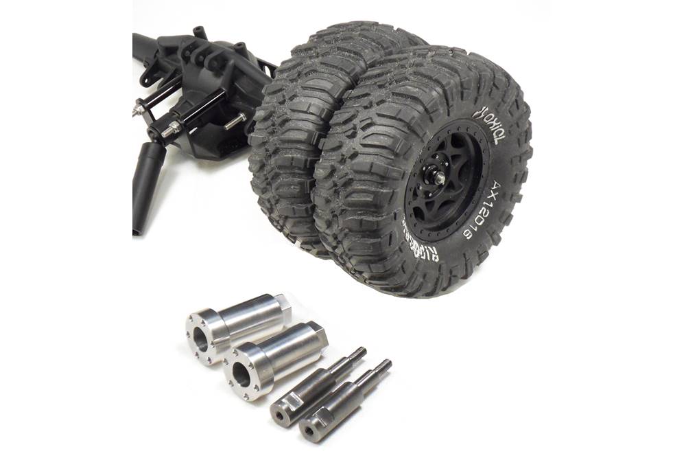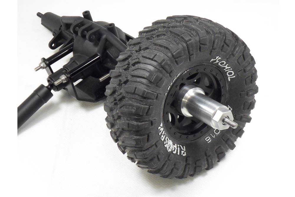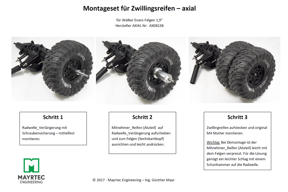 Durch unser ausgeklügeltes System kann ganz einfach und sicher ein Zwillingsreifen auf Ihr AXIAL Modell montiert werden. Dabei muss nichts gebohrt oder modifiziert werden. Durch die maßgenaue Fertigung der Mitnehmer-Reifen (aus hochfestem Aluminium) kann ein hohes Drehmoment auf das äußere Rad übertragen werden. Unsere Spezialteile für dieses Montageset (1Paar) – Zwillingsreifen für AXIAL Modelle werden bei uns gefertigt und anschließend geprüft – „Made in Austria“!