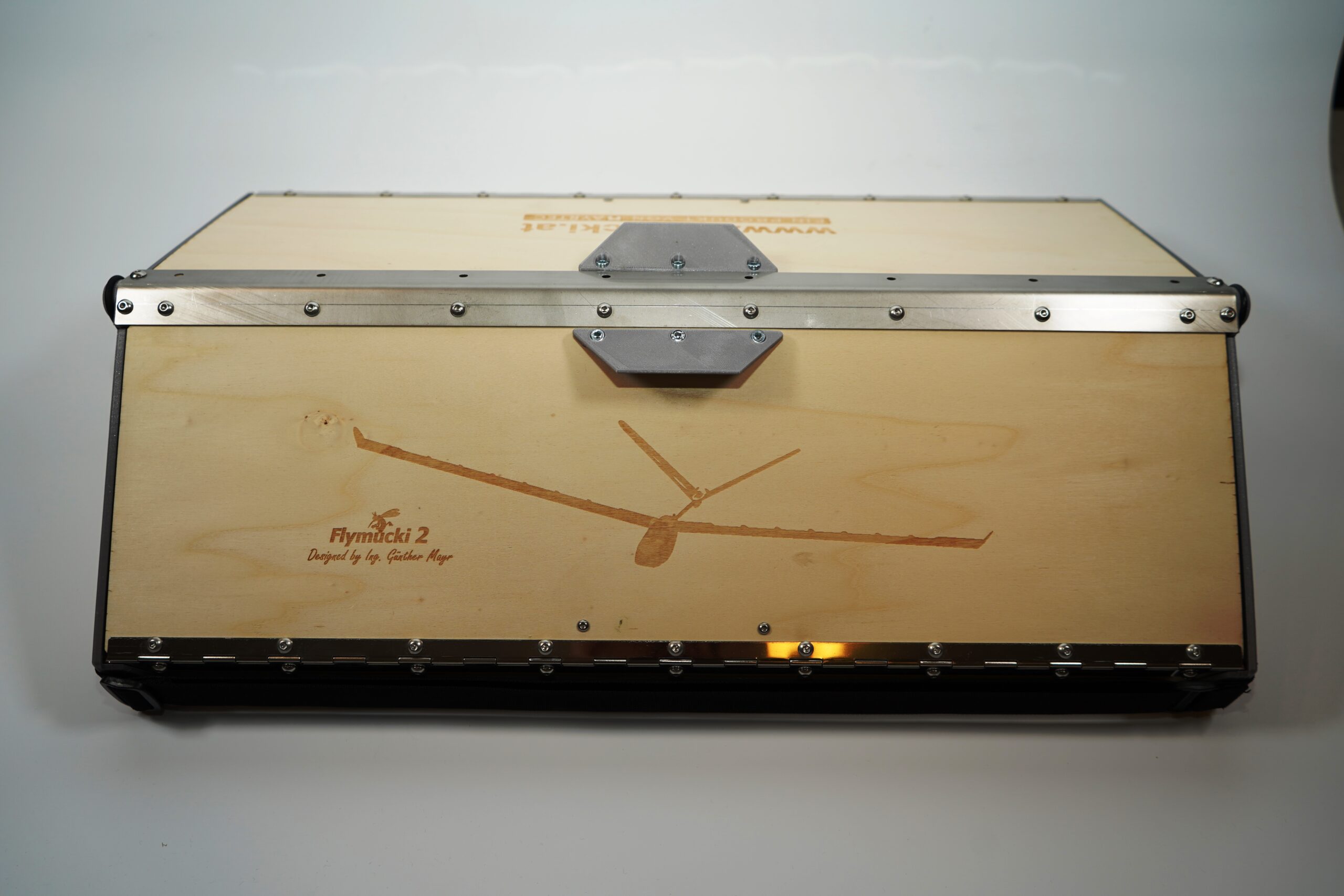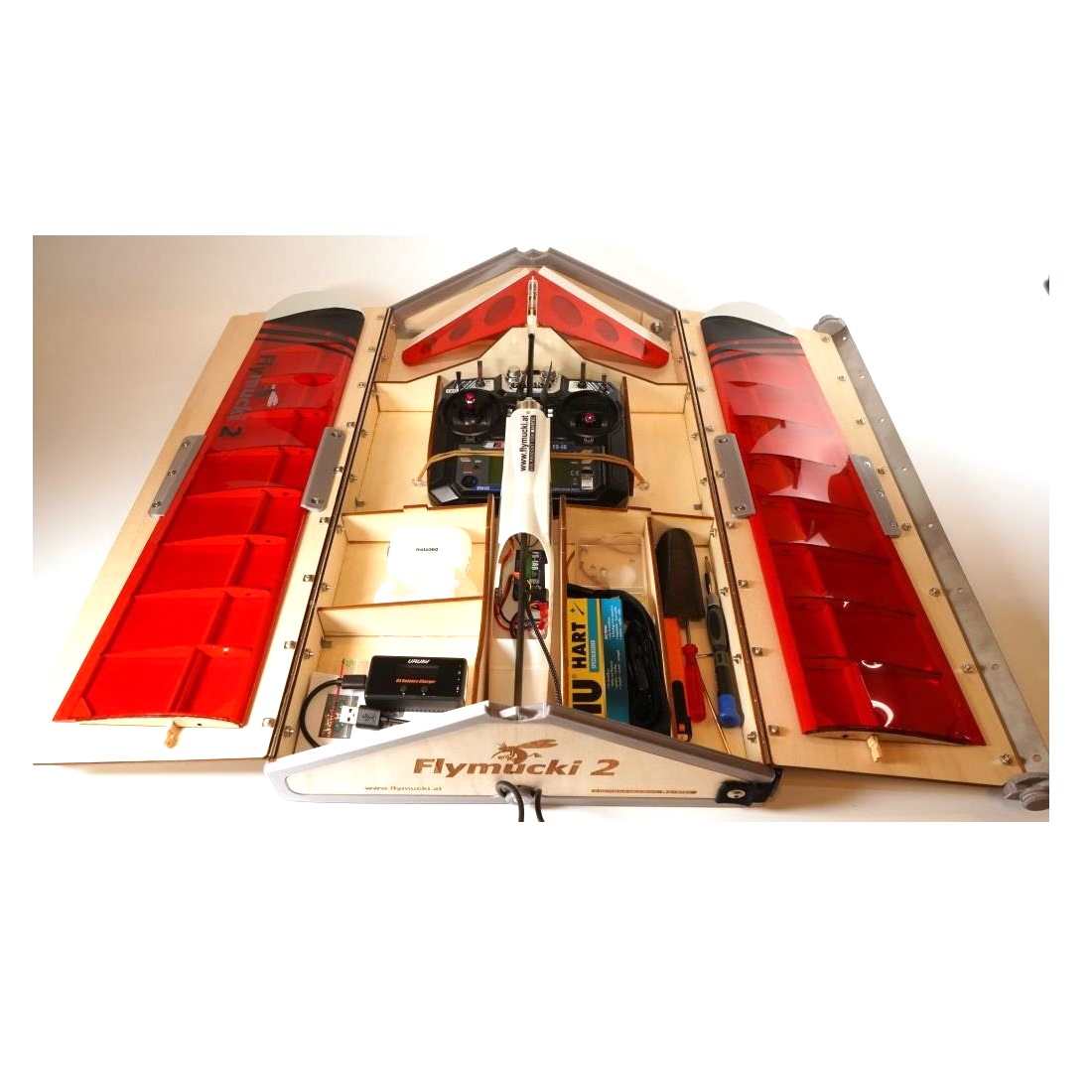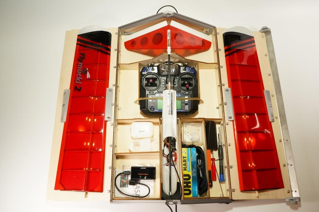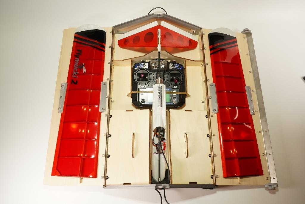 Eine stabile Transportbox mit Tragegurt – geeignet für die Aufbewahrung von Flugmodell, Sender und Zubehör.